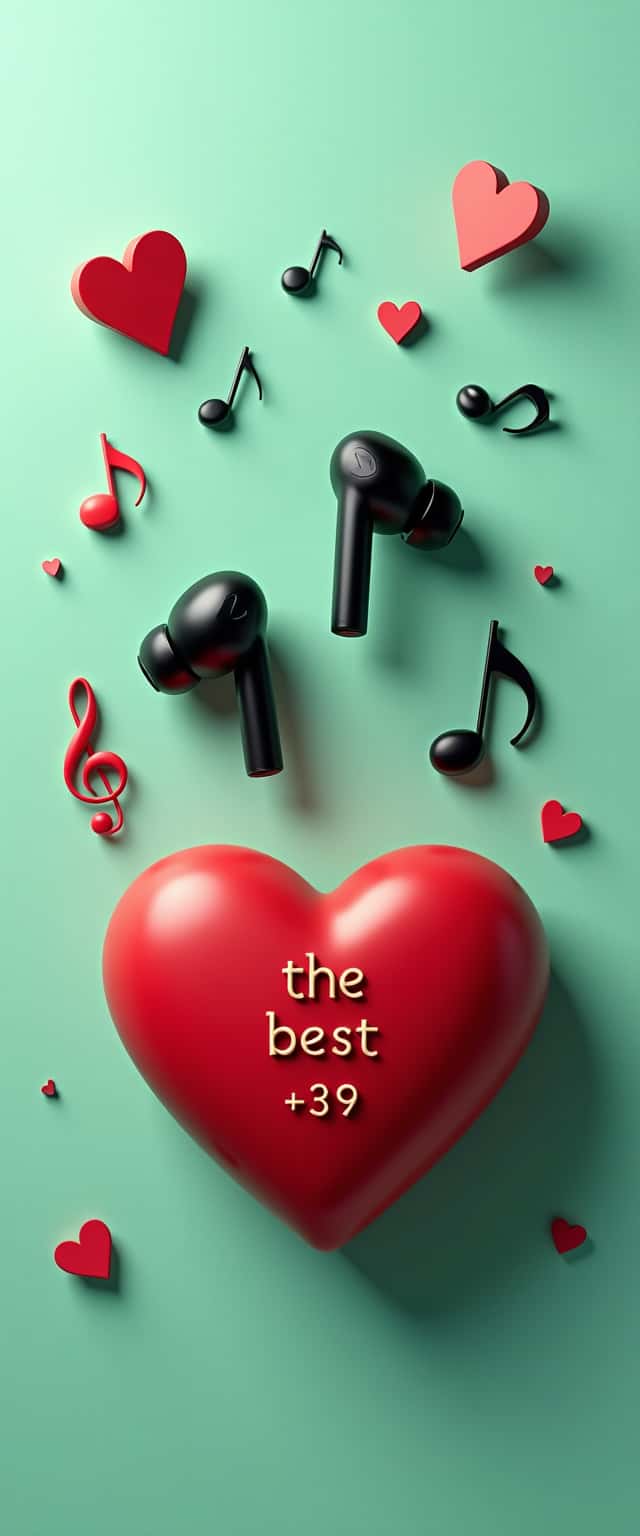 This stunning 3D composition features sleek black wireless earbuds floating against a soft mint green paper backdrop. Intertwining red heart-shaped musical notes encircle the earbuds, symbolizing creativity and love for music. Below, a large, bold red heart highlights the phrase 'the best', crafted in an elegant font. Beneath it rests a delicate '+39' engraving, enhancing the overall aesthetic. The high-contrast lighting adds depth and emphasizes the vivid colors of the composition, making it eye-catching and playful.