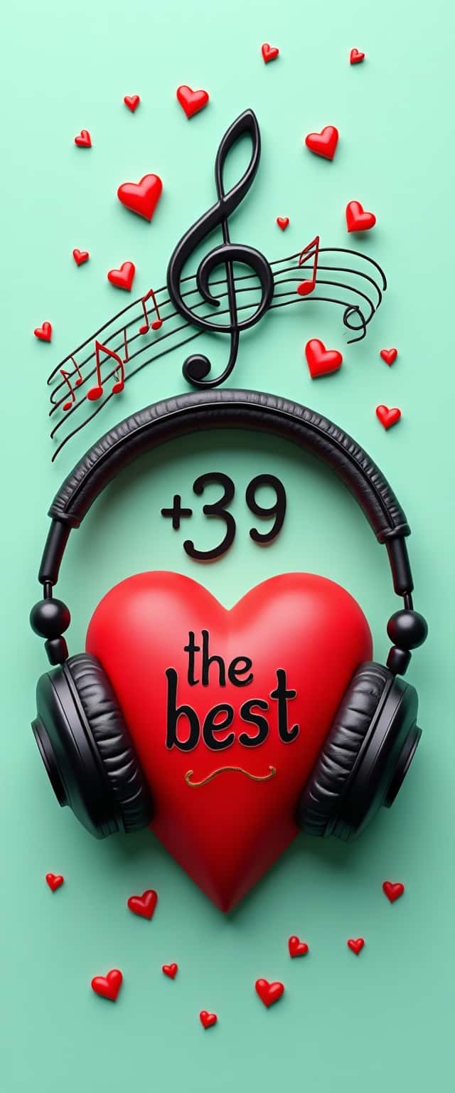 This vibrant design showcases a textured mint paper backdrop that enhances the tactile experience. At the center lies a glossy red 3D heart, symbolizing love and music, with sleek modern headphones resting atop. Surrounding the heart are clusters of playful 3D hearts and whimsical vintage musical notes, creating an engaging visual rhythm. A black musical staff elegantly weaves its way into the design, adorned with red 3D notes that further emphasize the musical theme. The phrase 'the best.' is playfully engraved within the heart, accented by a decorative '+39' around its edges, combining elements of affection and modernity. This design appeals to music lovers and romantics alike.