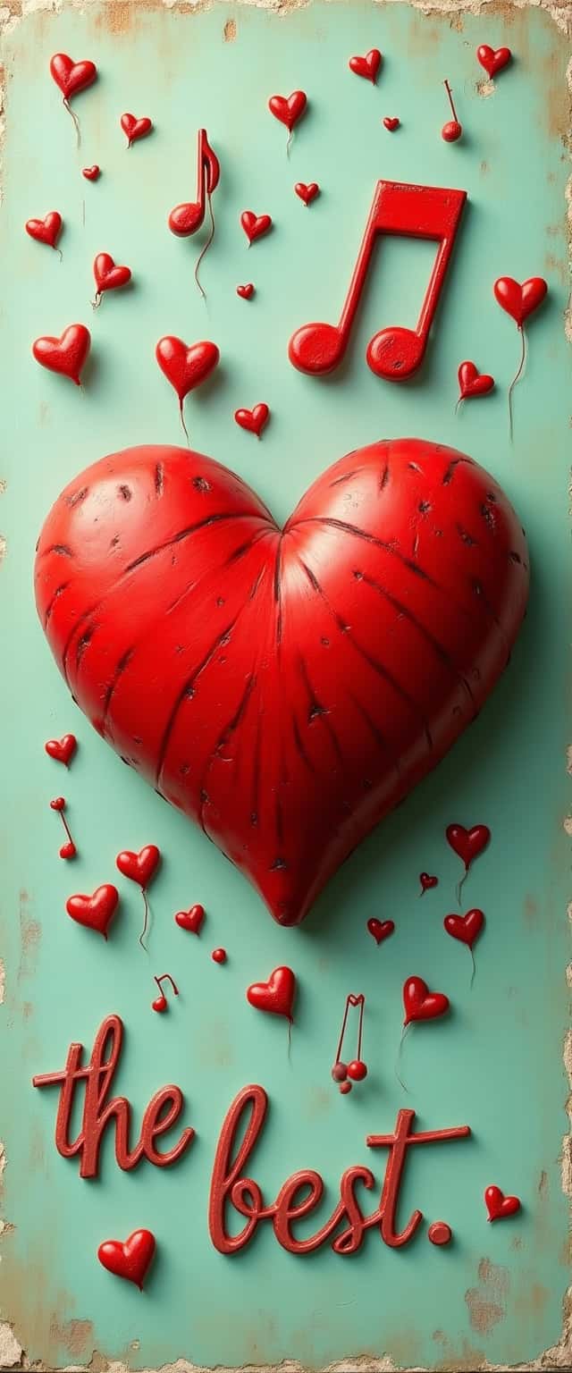 This design features a bold, intricately crafted red heart in 3D at its center, suggesting a sense of passion and vibrancy. It is accompanied by charming vintage headphones, embodying a musical theme. Surrounding the heart, tiny 3D hearts and musical notes create a dynamic visual effect, appearing to dance across the space, enhancing the heartfelt motif. The backdrop is an antique white mint paper that adds a nostalgic touch, while the engraved phrase 'the best' at the bottom personalizes the piece, making it perfect for expressing sentiments of love and appreciation. This design could be ideal for greeting cards, merchandise for music lovers, or even phone cases.
