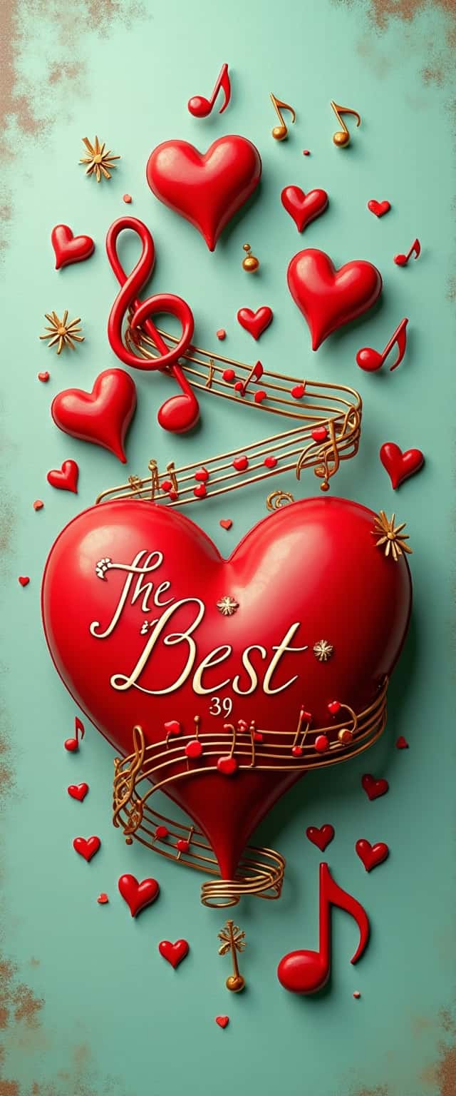 A soft mint green paper background, layered with a stylized, three-dimensional red heart resting low, surrounded by smaller 3D hearts and vintage musical notes floating above. Engraved beneath the heart reads, 'the best' in elegant script, with '+39' encircling it.