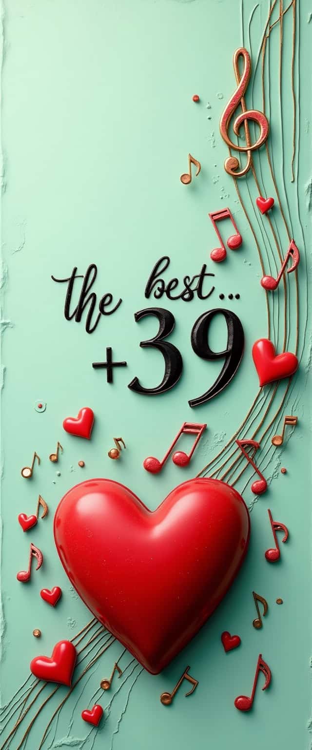 A soft mint green paper background, layered with a stylized, three-dimensional red heart resting low, surrounded by smaller 3D hearts and vintage musical notes floating above. Engraved beneath the heart reads, 'the best' in elegant script, with '+39' encircling it.
