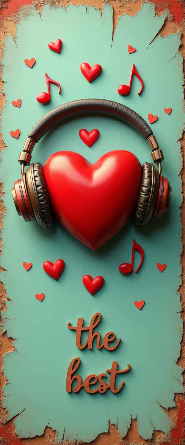 This design features a vibrant 3D heart in a rich oil red hue, adorned with retro-style headphones positioned on top. Surrounding the heart are small 3D hearts and musical notes, adding a sense of rhythm and festivity to the composition. The background presents a distressed antique white mint paper texture, characterized by jagged edges that enhance the vintage feel. At the bottom, an elegantly engraved fancy font proclaims 'the best', integrating seamlessly with the overall playful design. The combination of elements creates a striking visual that evokes themes of love and music.
