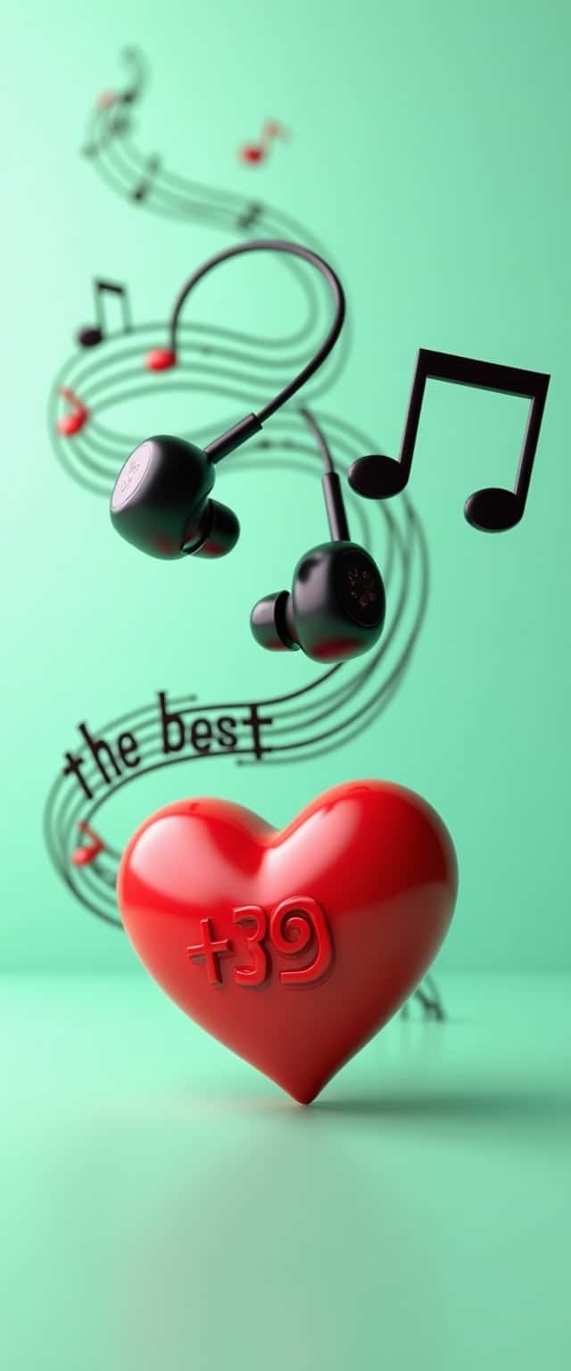 An engaging 3D artistic composition set on a smooth mint green paper backdrop, where a pair of modern black wireless earbuds hover in striking isolation. A dynamic, bold black musical staff spirals around them, peppered with glistening 3D red musical notes that pop in vibrant contrast. Anchored below, a beautifully rendered 3D red heart carries the affectionate text 'the best,' while a subtle engraving of '+39' sits gracefully underneath, offering a refined touch to this rhythmic celebration.