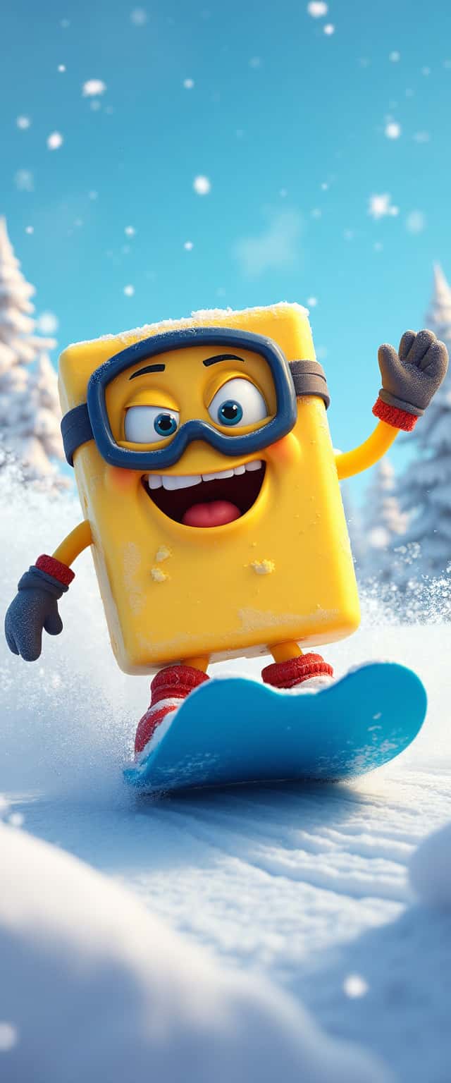 This lively design features an animated block of butter with a characteristic sly smirk, oversized ski goggles, and a playful demeanor. It is depicted skillfully navigating a vibrant, snow-covered slope on a neon blue sled, surrounded by shimmering snowflakes that enhance the winter atmosphere. The 3D style adds depth, making the scene pop with energy and a sense of fun. The butter's cute expressions and the colorful environment delineate an exciting winter adventure, appealing to both children and adults who appreciate whimsical designs.