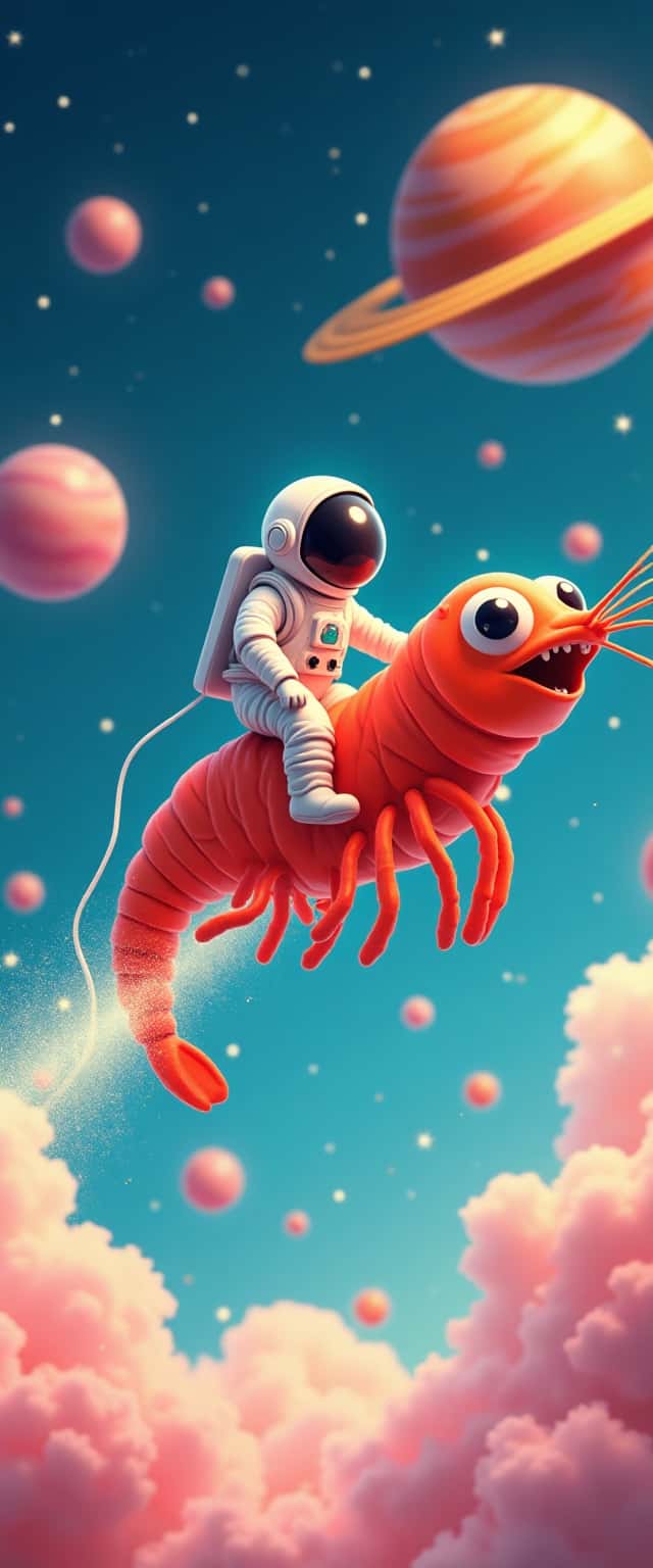 This vibrant design features an adventurous astronaut with wide eyes, joyfully riding a gigantic, multicolored flying shrimp, which is adorned with sparkling stardust. The shrimp's vivid colors create a playful contrast against the soft cotton candy clouds swirling around them. Brightly colored, smiling planets serve as a whimsical backdrop, enhancing the enchanting atmosphere of the scene. The use of rich hues and dynamic shapes engages the viewer's imagination, evoking a sense of fun and creativity. This playful imagery captures the spirit of exploration and adventure in a fantastical universe.