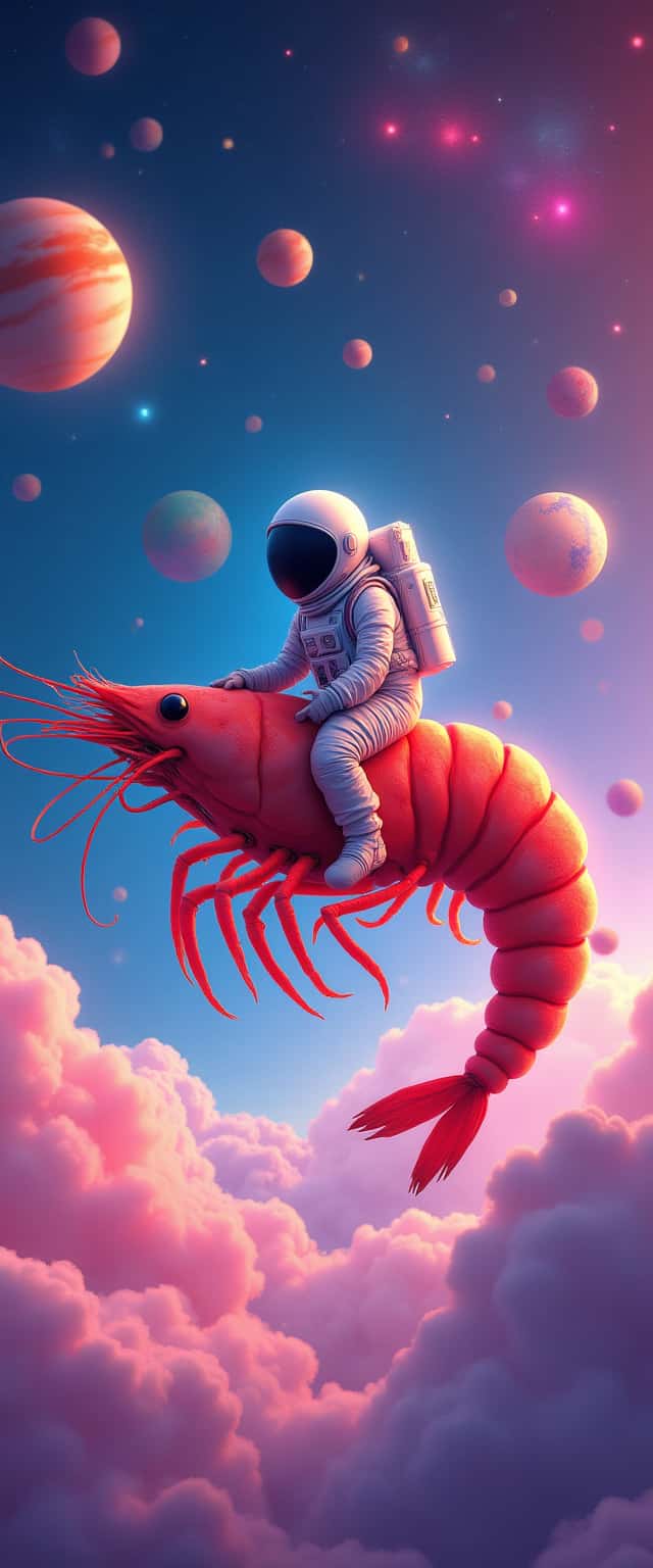 This whimsical design features a cheerful astronaut sitting atop a large, vividly colored shrimp, gracefully soaring amidst a backdrop of swirling cotton candy clouds. The scene is enriched by a myriad of radiant galaxies, with various planets scattered in the sky, each exhibiting friendly, smiling expressions. The deep blue and vibrant pink hues create a dreamy atmosphere that is both captivating and fantastical. The shrimp's exaggerated features and the astronaut's playful pose add a touch of humor to this imaginative journey through space, making it a delightful visual for both children and adults alike.