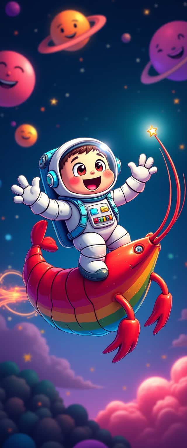 An exuberant astronaut cartoon character, with gleeful eyes and waving arms, joyfully travels on a giant shrimp painted in rainbow colors. They leave a sparkling trail of stardust amidst a chaotic background of hypnotic neon galaxies and mischievous, grinning planets, all showcased in a vertical layout to accentuate the humor.