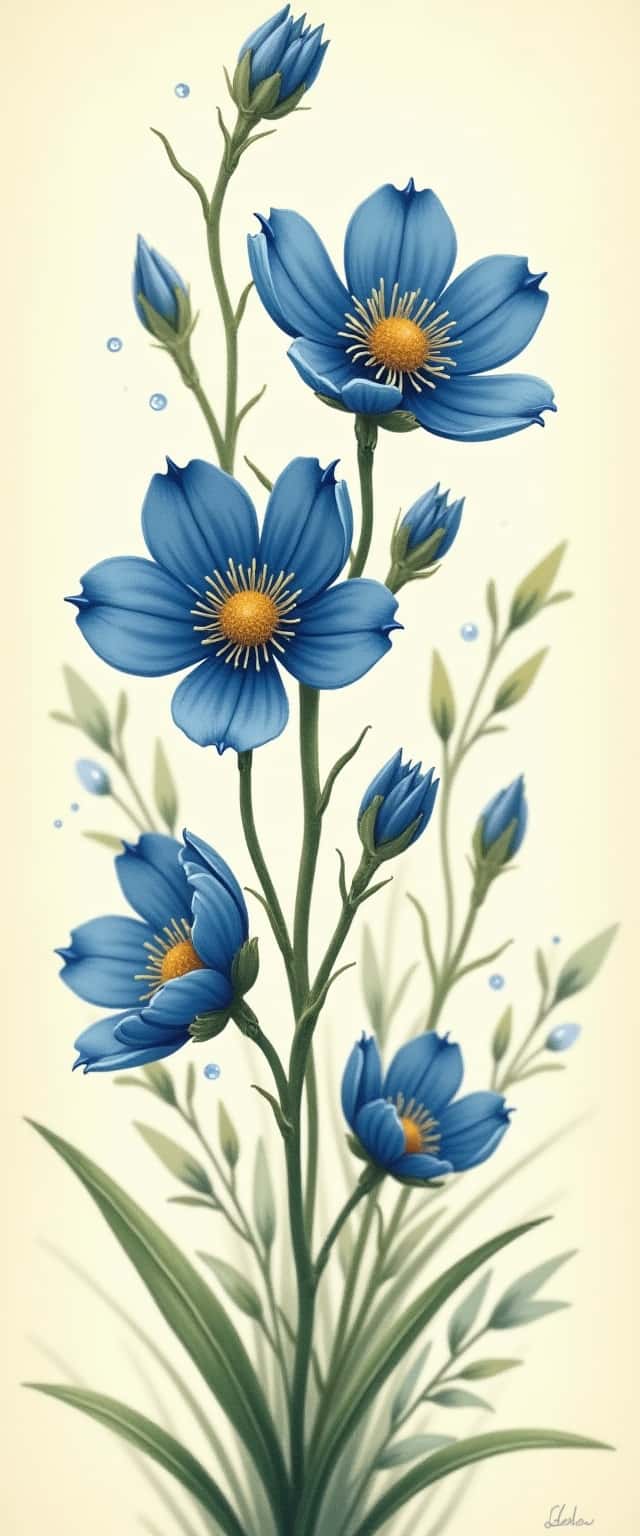 This exquisite design showcases a close-up of intertwined blue wildflowers, illustrated in a vintage botanical style. The vibrant blue petals glisten with dewdrops, providing a fresh and lively appearance, while soft shadows add depth and dimensionality to the overall composition. The flowers are complemented by delicate green foliage, creating an elegant contrast against the subtle cream backdrop. This piece captures the enchanting essence of nature, making it suitable for a variety of applications, from home decor to stationery. The intricate details and soothing color palette evoke a sense of tranquility and appreciation for the beauty of the natural world.