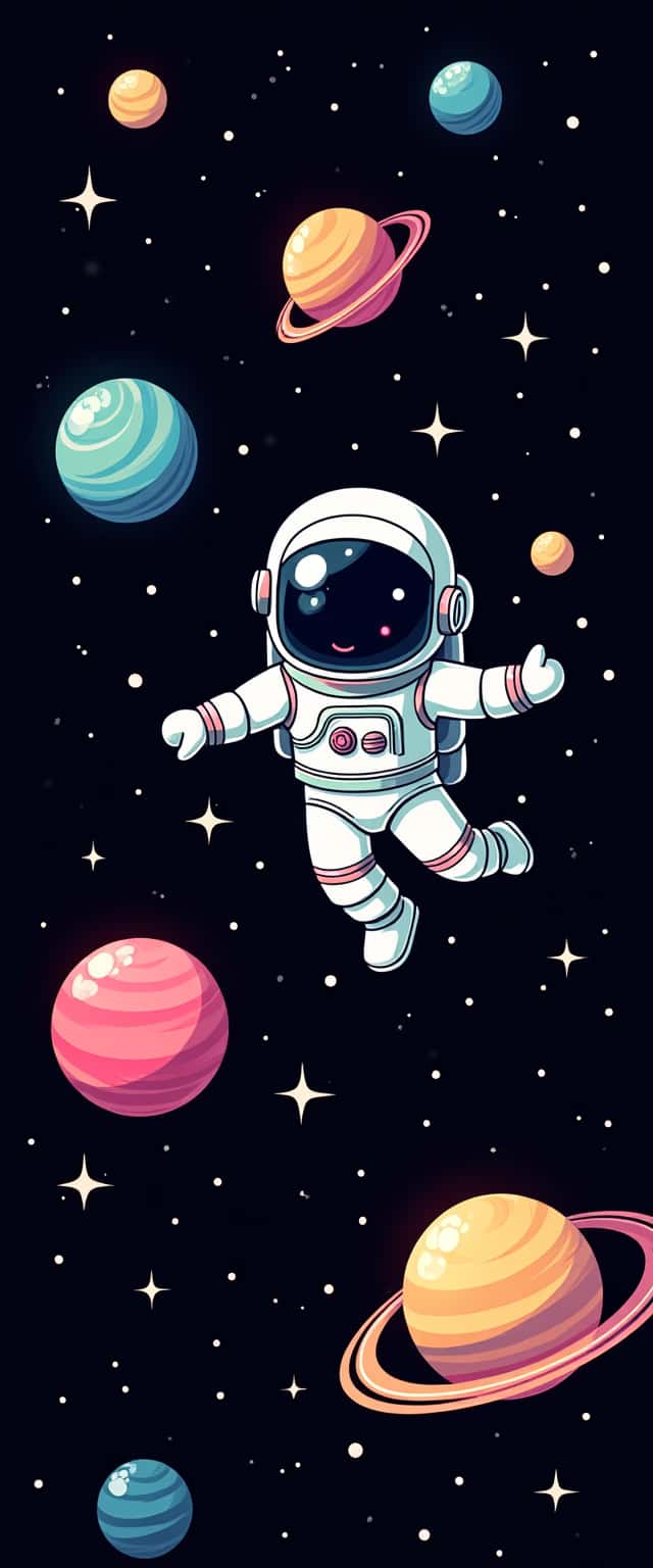 This design features a sleek black backdrop filled with a playful cartoon-style universe. At the center is a joyful astronaut in a cheerful pose, floating amidst a dynamic array of vibrant planets in shades of pink, blue, and yellow. The planets exhibit playful rings and textures, creating a sense of motion. Distant sparkling stars twinkle around, enhancing the cosmic atmosphere. The overall aesthetic is engaging, catering to both children and adults with a love for whimsical space themes.