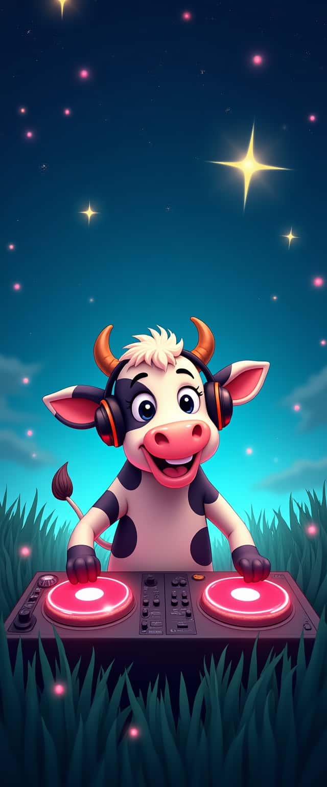 Under a sparkling starlit sky, a cheeky cartoon cow with a wide grin and oversized headphones rocks the turntables. Surrounding it, swirling disco lights dance around, illuminating long blades of grass gently swaying in the breezy night.