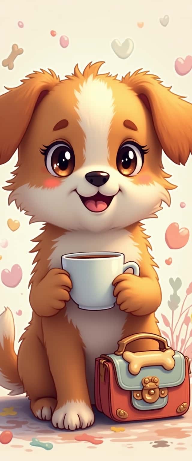 A close-up of a fluffy cartoon dog with delightful big eyes, holding a warm cup of coffee and a smartphone, surrounded by splashes of pastel colors and playful doodles. The purse next to it is adorned with a cute dog bone charm, adding a playful touch.