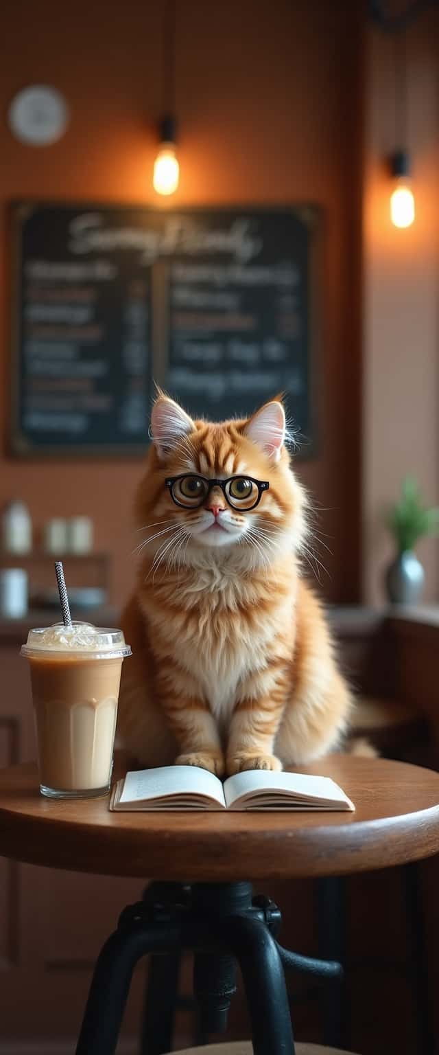 An adorable fluffy cat, wearing stylish glasses, is perched on a bar stool with a book open in front of it. The backdrop features a trendy coffee shop ambiance; rich brown tones, creamy light fixtures, and a chalkboard menu filled with beverages, including a frosted iced coffee beside the kitty.