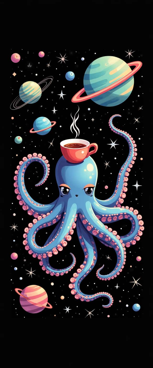 This whimsical design features a cheerful octopus with elegant, spiraling tentacles, gracefully balancing a steaming cup of tea. The octopus is set against a dramatic black background, which enhances the vibrant colors of the surrounding retro sci-fi planets and celestial bodies. The octopus itself is depicted in a playful light blue, with its pink suckers providing a fun contrast. The steaming tea cup adds a cozy and inviting touch to the overall composition. The planets offer a dynamic backdrop with diverse colors and rings, enhancing the playful, otherworldly theme of the design. Overall, this combination of elements creates a joyful scene full of curiosity and charm, perfect for adding a splash of personality to various products.