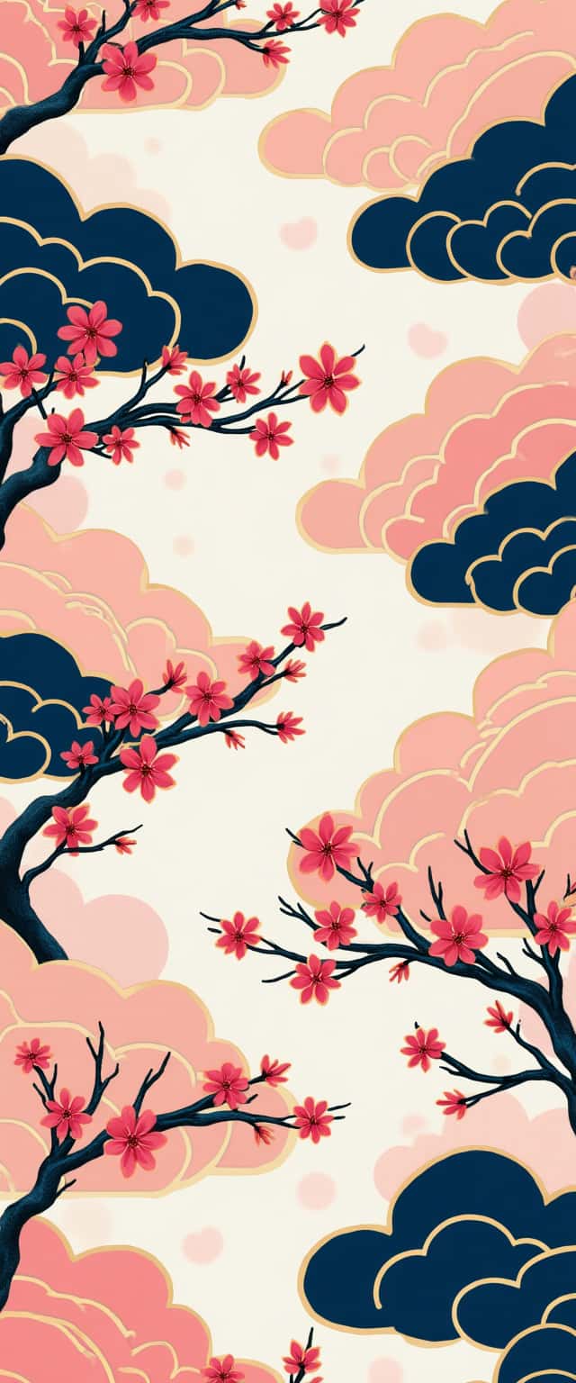 This elegant design features a repeating pattern of pink and blue clouds, each adorned with striking golden outlines. Intertwined with graceful cherry blossom branches, the composition blends modern graphic elements with classical Chinese aesthetics. The soft hues of pink and blue create a calming atmosphere, while the golden accents add a touch of sophistication. The graceful branches with delicate blossoms enhance the visual rhythm, evoking a sense of tranquility and beauty. Ideal for applications such as fabric prints, wallpapers, or home decor, this design captures the essence of spring and natural beauty.