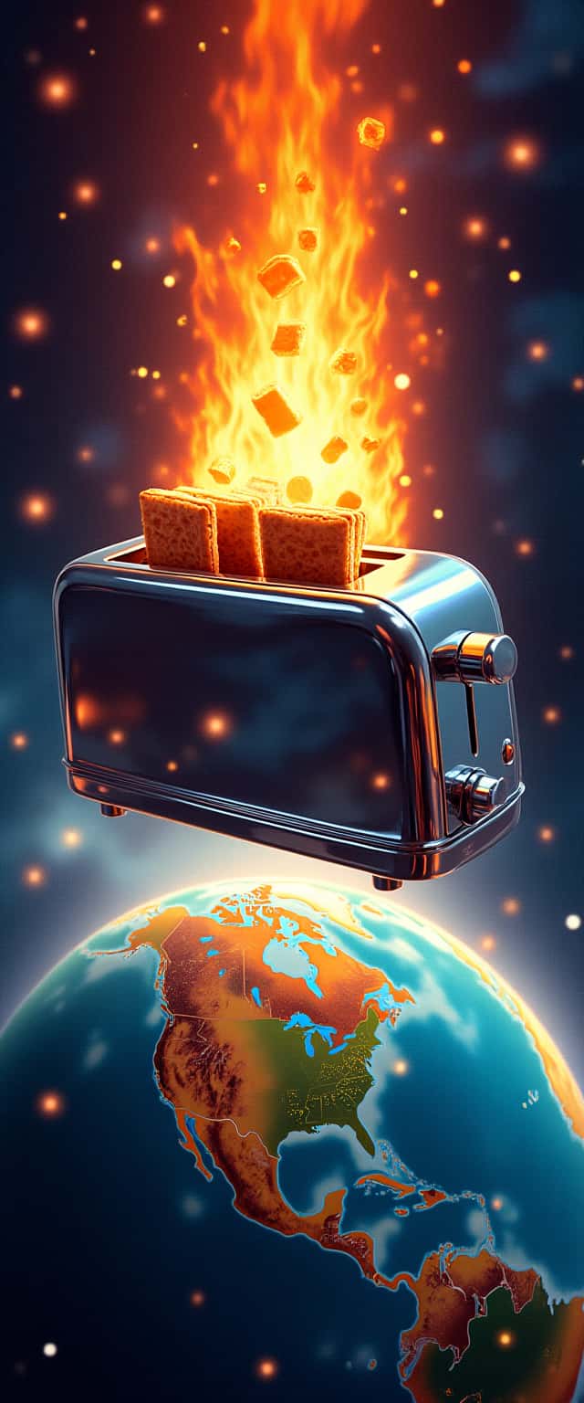 This imaginative design showcases a shiny, reflective chrome toaster dramatically suspended in a cosmic setting, surrounded by a vibrant star-filled galaxy. Flames burst from its slots, launching Pop-Tarts like fiery meteorites towards a beautifully illustrated Earth below, which features vintage sci-fi maps in electric colors. The dynamic visual elements, including the contrasting metallic sheen of the toaster against the deep space backdrop and the bright flames, create a whimsical, otherworldly effect. The detailed Earth adds a layer of intrigue, harmonizing the themes of domesticity with cosmic adventure, making it a striking piece that evokes both nostalgia and imagination.