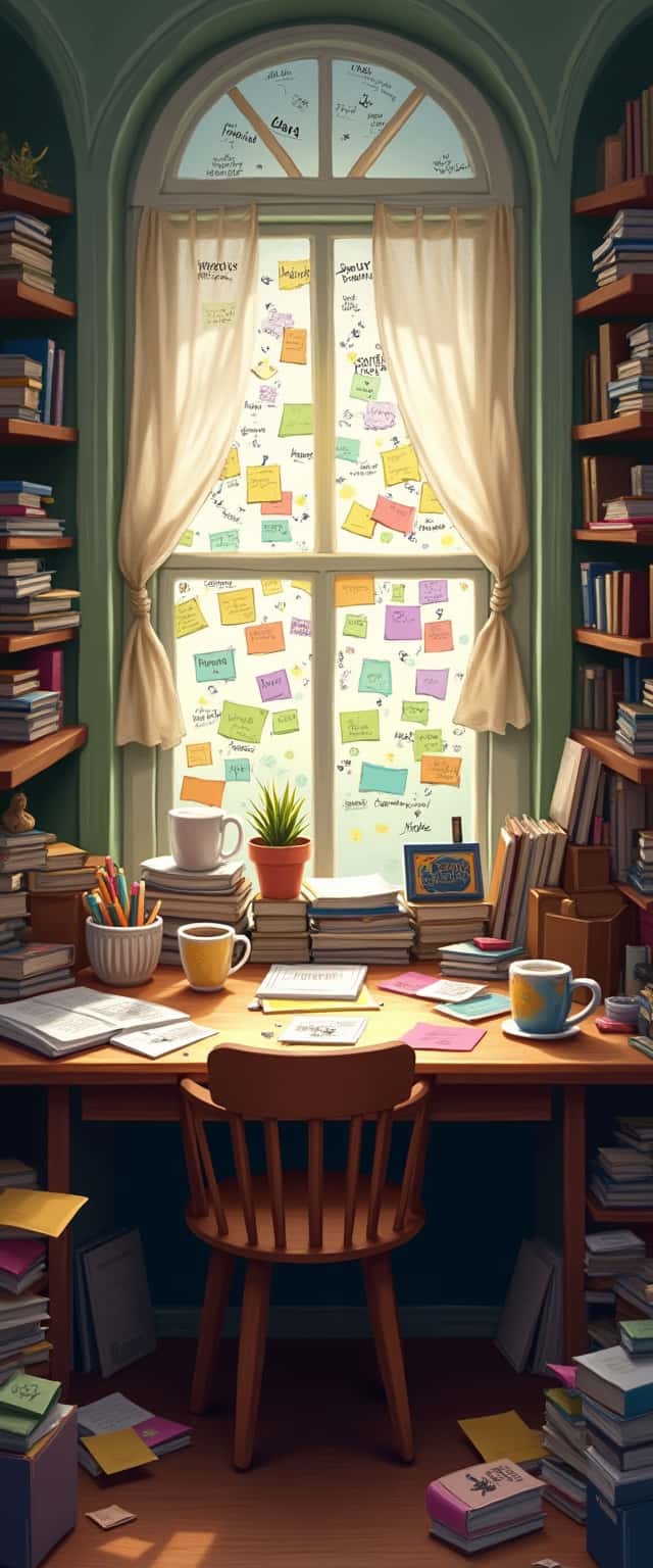 This intricate design captures the essence of a cluttered desk, infused with a warm, cozy atmosphere. The scene is adorned with coffee cups, half-finished books, and a wooden chair that invites a relaxed ambiance. Soft, natural lighting filters through a window, illuminating the space and highlighting a whimsical calendar filled with unmarked due dates. Colorful sticky notes are scattered throughout, adding vibrancy and a touch of playful procrastination energy. Bookshelves are densely packed, suggesting a love for literature and learning. The overall composition reflects a familiar and relatable workspace, perfect for creatives or students cultivating their ideas amidst organized chaos.