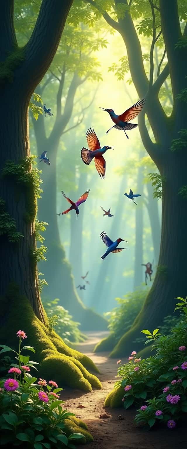 This design showcases a vibrant scene featuring a flock of colorful birds soaring gracefully in a lush green forest. The sunlight streams down through the canopy, illuminating the rich foliage and casting soft shadows on the forest floor. The dynamic movement of the birds in mid-flight contrasts beautifully with the tranquility of ancient trees, which are adorned with moss and delicate flowers. The pathway meanders through the forest, inviting viewers to explore the serene environment that is alive with color and life.