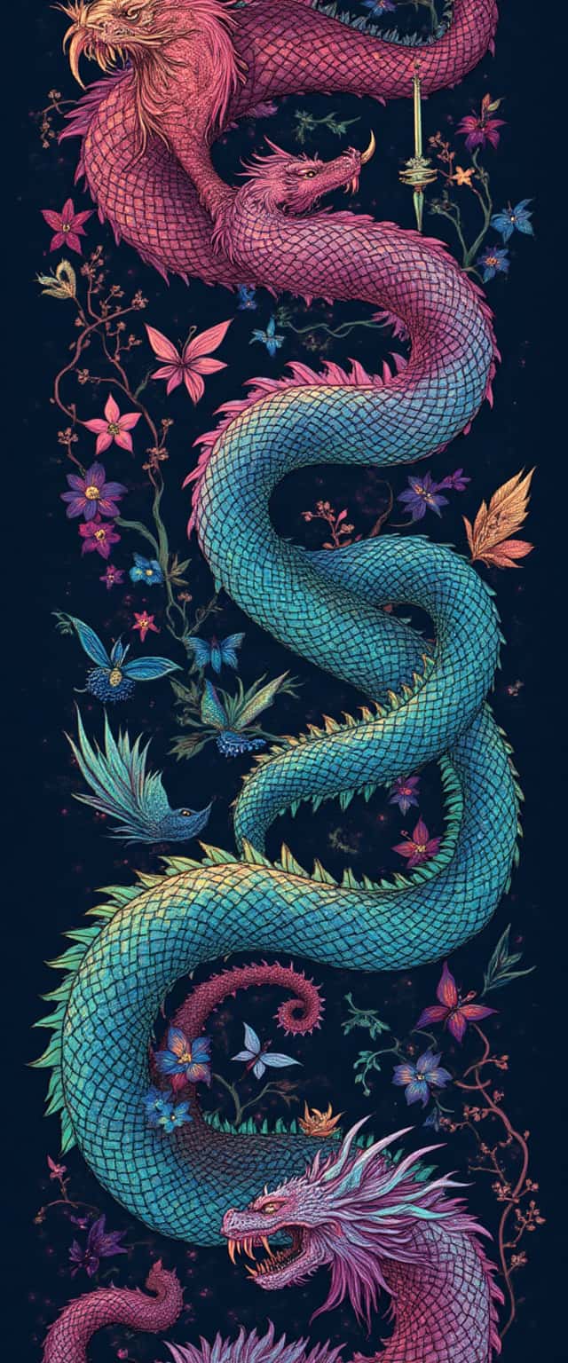 This design portrays fierce dragons entwined within vibrant luminescent vines, flowers, and swords, against a deep midnight blue backdrop. The dragons are depicted in striking pink and turquoise hues with scales that shimmer in gradients, enhancing their fierce presence. Tiny winged fae flit through the scene, accentuating the lively ambiance. The addition of colorful flowers and swords introduces an adventurous theme, while the intricate details in the dragons' forms and the surrounding natural elements create a mesmerizing tapestry that balances fantasy and elegance. The overall composition invites viewers into a world of magic and mythical battles, making it perfect for products that require a captivating touch.