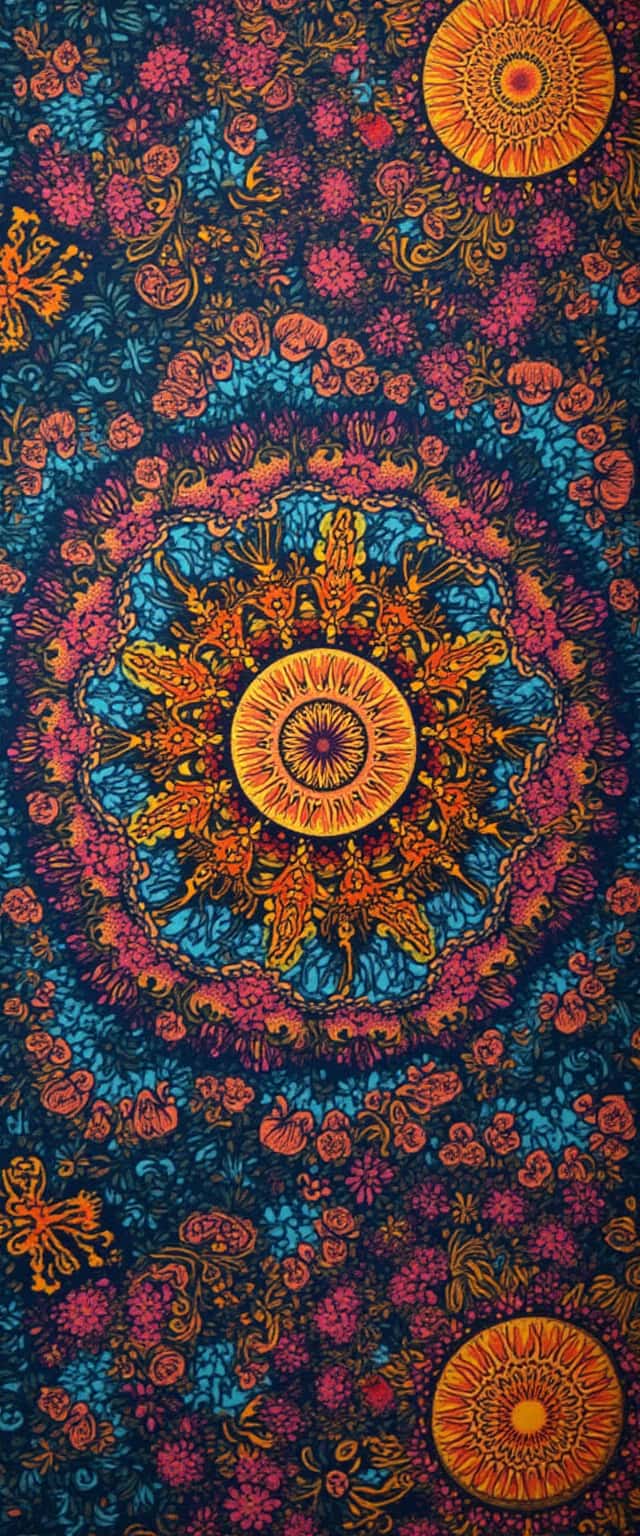 An intricate mandala pattern bursting with colors, featuring swirling vines, flowers, and geometric shapes. Each segment is a different color palette, creating a kaleidoscopic effect that draws the eye in. Background texture complements the vibrant detail.
