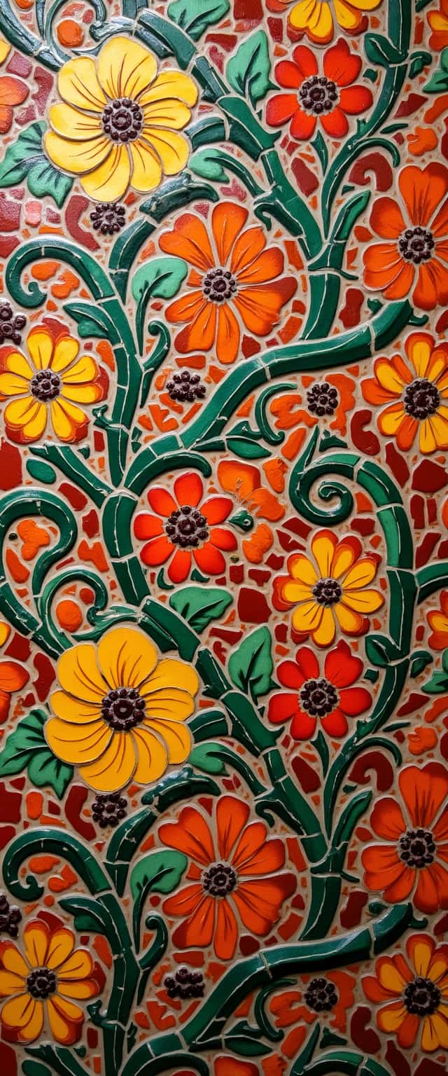 This design features a dynamic, repeating pattern of colorful mosaic fragments inspired by traditional Mediterranean artistry. The intricate composition highlights twisting vines laden with vivid flowers in bright reds, yellows, and rich greens. Each flower is detailed, evoking a sense of movement and life. The mosaic fragments display a textured, slightly raised surface, enhancing the tactile quality of the pattern, making it visually appealing as well as engaging to touch. This vibrant arrangement could serve as a wallpaper, textiles, or decorative art pieces, bringing a touch of Mediterranean charm to any interior space.
