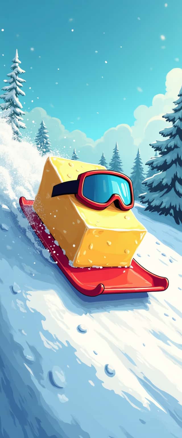 This vibrant comic-style illustration features a glossy block of butter zooming down a winter slope on a bright red sled. The butter sports oversized ski goggles, adding a humorous twist to the scene. Snow erupts around it, cascading in colorful bursts, creating a festive ambiance. Tall evergreen trees frame the backdrop, contrasted against a bright blue sky, enhancing the sense of movement and joy. The playful portrayal merges humor with holiday cheer, appealing to audiences looking for fun winter-themed art.