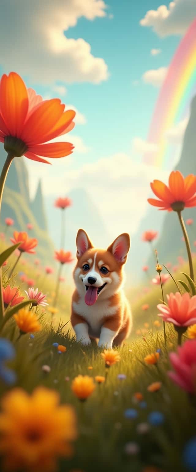 This enchanting design features a corgi joyfully exploring a vibrant, magical landscape. The foreground is adorned with a meadow filled with giant, floating flowers in vivid colors, including orange and pink, that exude a playful atmosphere. The corgi, with its characteristic fluffy ears and expressive eyes, sits amidst this colorful scene, radiating happiness with its tongue out. In the background, gentle hills rise under a clear blue sky, while a shimmering rainbow arches gracefully, adding a layer of whimsy to the scene. Soft rays of light filter through, enhancing the landscape's dreamlike quality and creating a serene yet exhilarating ambiance.