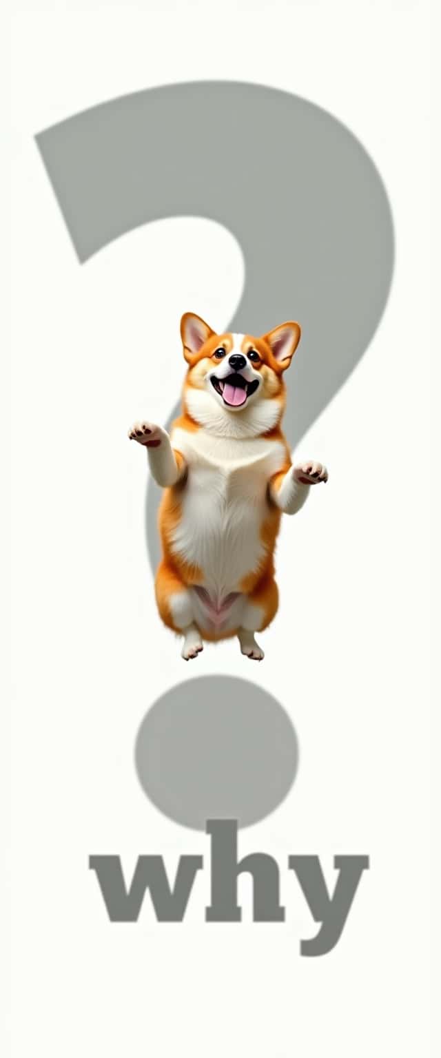 A corgi floats effortlessly in a zero-gravity realm, its fluffy fur gently billowing around it like clouds. Above, a colossal, bold exclamation point casts a dramatic shadow, while below, the oversized, comically italicized 'why' sprawls across a crisp white background, demanding attention.