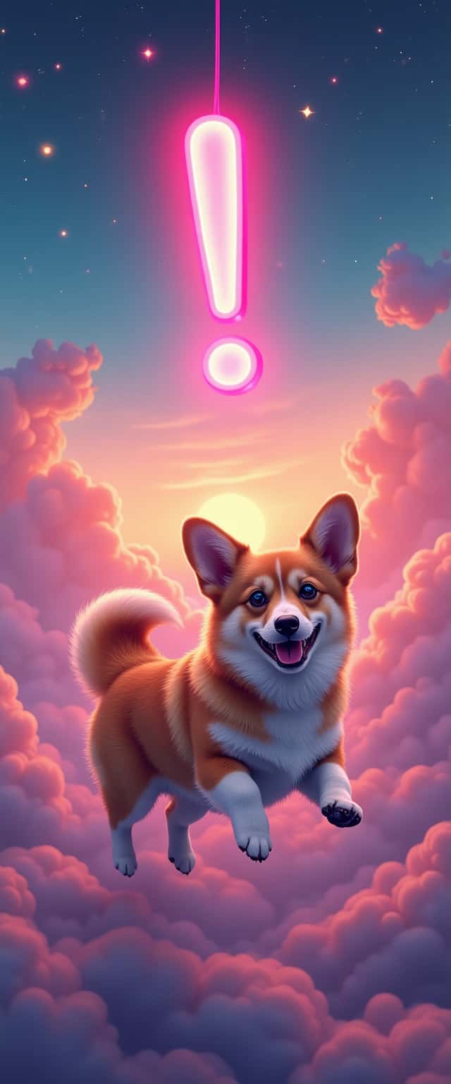 In a whimsical cosmic scene, a carefree corgi glides through a pastel expanse, its fur dancing with the colors of a sunset. Suspended above, a giant neon exclamation point contrasts with a playful, oversized 'why' written in cheeky italics, splashed across the canvas.