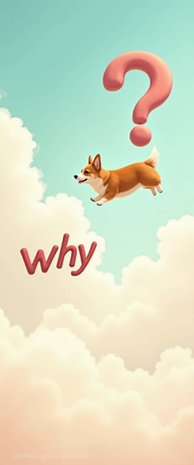 Picture a whimsical world where a happy corgi glides effortlessly through a pastel sky, its fur animatedly flowing. A gigantic exclamation point floats ominously above, while below, the curious, slanted text 'why' sprawls across a smooth, stark canvas, inviting viewers to ponder life’s big questions.