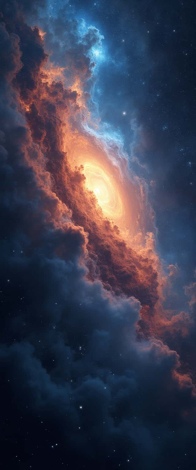 This captivating design features a breathtaking cosmic vista showcasing swirling nebulae in vibrant shades of electric blue and fiery orange. Dotted with bright white stars, this depiction evokes the majestic vastness of the universe against a deep black canvas. The blend of colors creates a dynamic visual narrative, illustrating the beauty and complexity of cosmic phenomena. The intricate details of the nebulae and star fields invite viewers to lose themselves in the infinite possibilities of space. This artwork serves as a stunning reminder of the mysteries and wonders of the cosmos, making it perfect for space enthusiasts or as a heart-stirring decoration for various living spaces.