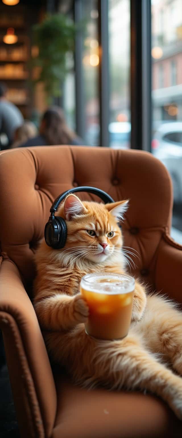 This design features a fluffy tabby cat lounging comfortably in a plush chair, wearing oversized headphones, and holding a frosty cup of iced coffee. The warm sunlight streams through tall windows, highlighting the vibrant plants that add life to the cozy atmosphere. The background subtly hints at a bustling cafe scene, enhancing the inviting and warm vibe. The cat, appearing relaxed and content, embodies a playful yet serene presence, making it an ideal design for cat lovers and cafe enthusiasts alike. This charming depiction captures the essence of cozy moments at a cafe, promoting a feeling of relaxation and comfort.