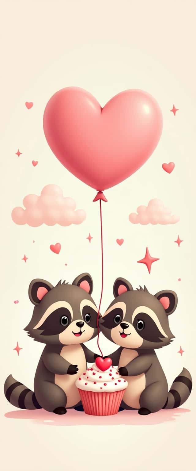 A cute cartoon illustration of two joyful raccoons sitting together under a pastel pink heart-shaped balloon, surrounded by fluffy clouds and sparkling stars, connecting with a shared cupcake topped with heart sprinkles, emphasizing warmth and love.