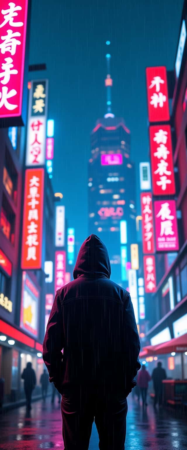 This design features a captivating cyberpunk cityscape drenched in rain, characterized by a blend of vibrant neon colors from glowing signs. Prominent Japanese kanji script adds an authentic urban texture, enhancing the overall futuristic aesthetic. A solitary hooded figure stands in the foreground, their silhouette contrasting starkly with the brilliance of the neon lights and glitchy holograms. Reflections in the rain-slicked streets amplify the visual depth, inviting the viewer to imagine the bustling life within the city. The dark setting, punctuated by illuminated signs, creates a sense of mystery and intrigue, typical of cyberpunk narratives.