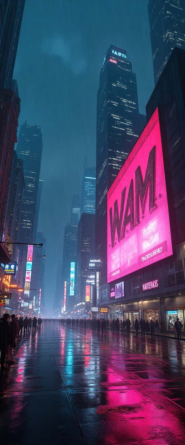 This cyberpunk metropolis captures a vibrant and immersive nighttime scene, showcasing towering skyscrapers illuminated by an array of neon lights. The rain-soaked streets reflect a dazzling display of colors, particularly a massive hot pink billboard prominently featuring the word 'WAM.' Surrounding the billboard are various flickering holograms, enhancing the futuristic feel of the setting. Pedestrians, dressed in eclectic futuristic attire, add a sense of life and movement, navigating the bustling urban atmosphere. The overall composition conveys a blend of technology and urban culture, creating a captivating visual narrative.