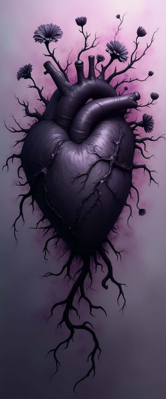An abstract portrayal of a darkened heart, surrounded by jagged black thorns and monochrome flowers wilting away. Shades of deep purple swirl around it, creating a swirling fog that encapsulates pain and despair, evoking a poignant sense of loss.