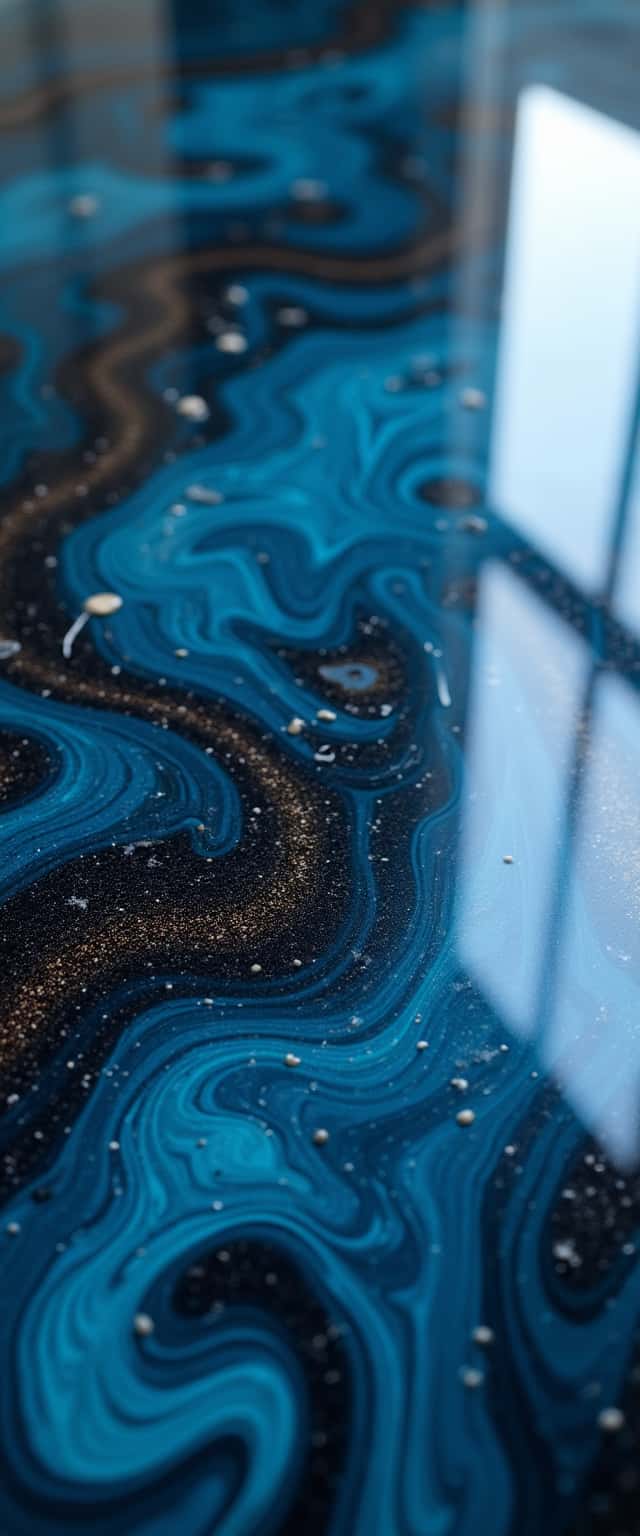 This close-up of epoxy flooring reveals a stunning blend of deep blue and rich matte black, characterized by mesmerizing swirls and a glossy sheen. The intricate patterns dance under light, resembling a polished gemstone canvas, creating a visual allure that captivates the viewer. The texture is enhanced by subtle reflective elements, which add depth and intrigue. Scattered particles contribute to the organic feel, providing a tactile experience that draws users in. Ideal for modern interiors, this flooring can elevate spaces with its unique aesthetic while also being functional and durable.
