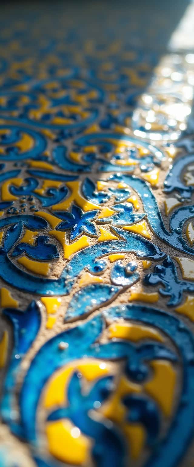 This close-up view showcases a beautifully ornate Islamic tile, featuring a stunning interplay of smooth blue and yellow hand-painted motifs. The glossy surface reflects light, enhancing the intricate craftsmanship displayed in the elaborate ornamentation. Shadows cast across the tile create depth, emphasizing its detailed texture and inviting viewers to admire both the artistry and cultural significance behind such a design. The vibrant colors work harmoniously, illustrating the depth of tradition in Islamic tilework. This design not only celebrates visual aesthetics but also embodies the rich history of craftsmanship in Islamic art.