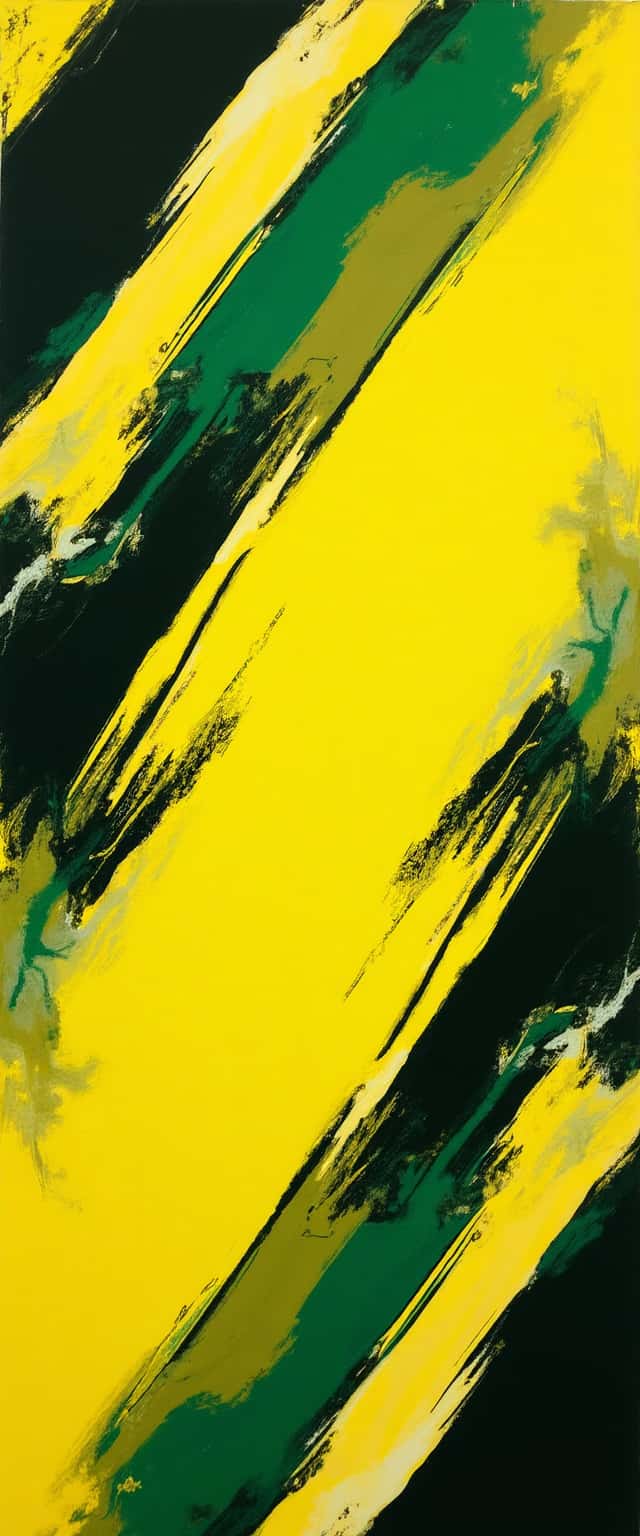 This design features a dynamic composition of angled and straight lines that intersect across a vivid canvas of yellows, greens, and deep black. The bold brush strokes give the impression of energy and movement, as vibrant yellows dominate the background, contrasting sharply with the darker green and black hues. The layered application of paint creates a textured effect that draws the eye and emphasizes the fluidity of the design, evoking a sense of liveliness and modernity. Ideal for use in digital backgrounds, print applications, or as a statement piece in interior decor.