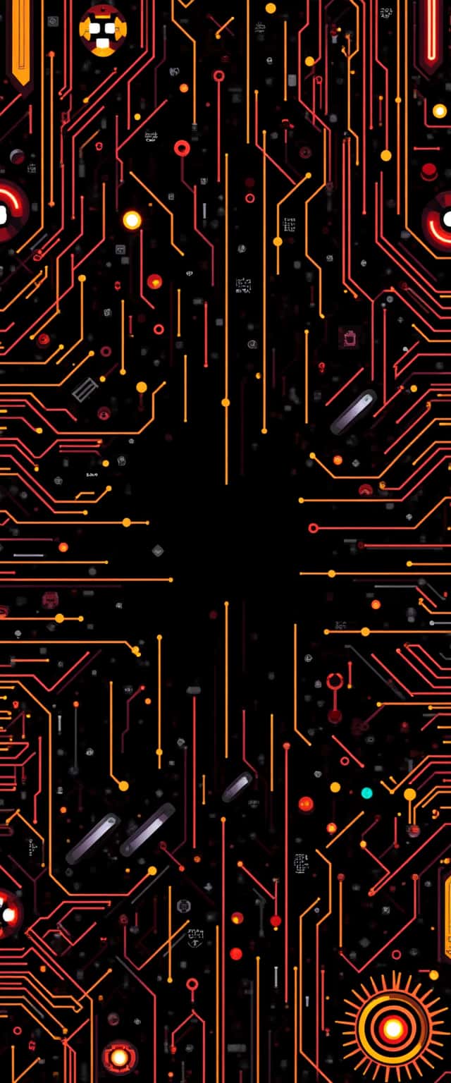 This design features a sleek black background that serves as a canvas for vibrant circuit patterns in electric white, fiery red, sunny yellow, and bold orange. Interwoven geometric shapes, including funky gears and daring triangles, create a sense of dynamic energy, reflecting the excitement of innovation and technology. The contrasting colors add depth, while the intricate patterns of circuits evoke feelings of movement and connectivity. The overall composition draws the viewer in, capturing modern technological aesthetics and providing a visually stimulating experience.