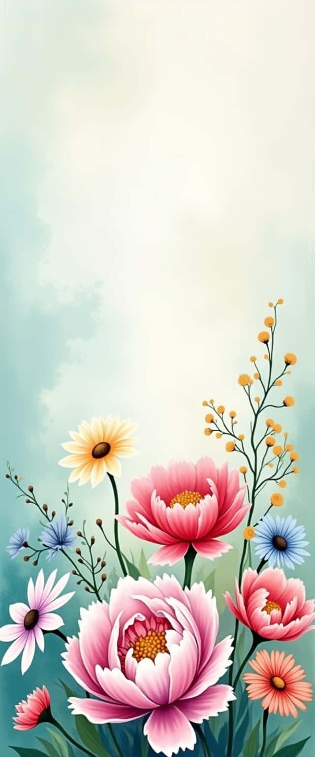 This design features a close-up of an eclectic mix of watercolor flowers, prominently displaying peonies and daisies. The bold brushstrokes bring the vibrant colors of the flowers to life, creating a striking contrast against the softly textured, light teal backdrop. The arrangement showcases a variety of shapes and sizes of the blooms, providing depth and visual interest. Delicate green leaves and stems add a natural touch, enhancing the organic feel of the design. This piece evokes a calm atmosphere while celebrating the beauty of nature through its dynamic colors and artistic style.