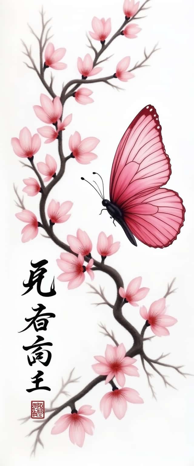 This design features a majestic pink butterfly gracefully spread across a pristine white background, blending seamlessly with delicate cherry blossoms. The intricate black Chinese calligraphy weaves through the cherry blossom branches, emphasizing the elegance and sophistication of East Asian aesthetics. The vibrant pink tones of the butterfly contrast beautifully against the muted hues of the blossoms, while the flowing script adds a layer of artistic depth, evoking a sense of harmony in nature and art. This piece embodies the delicate beauty of spring and the intricate artistry of Chinese culture, making it a striking visual statement.