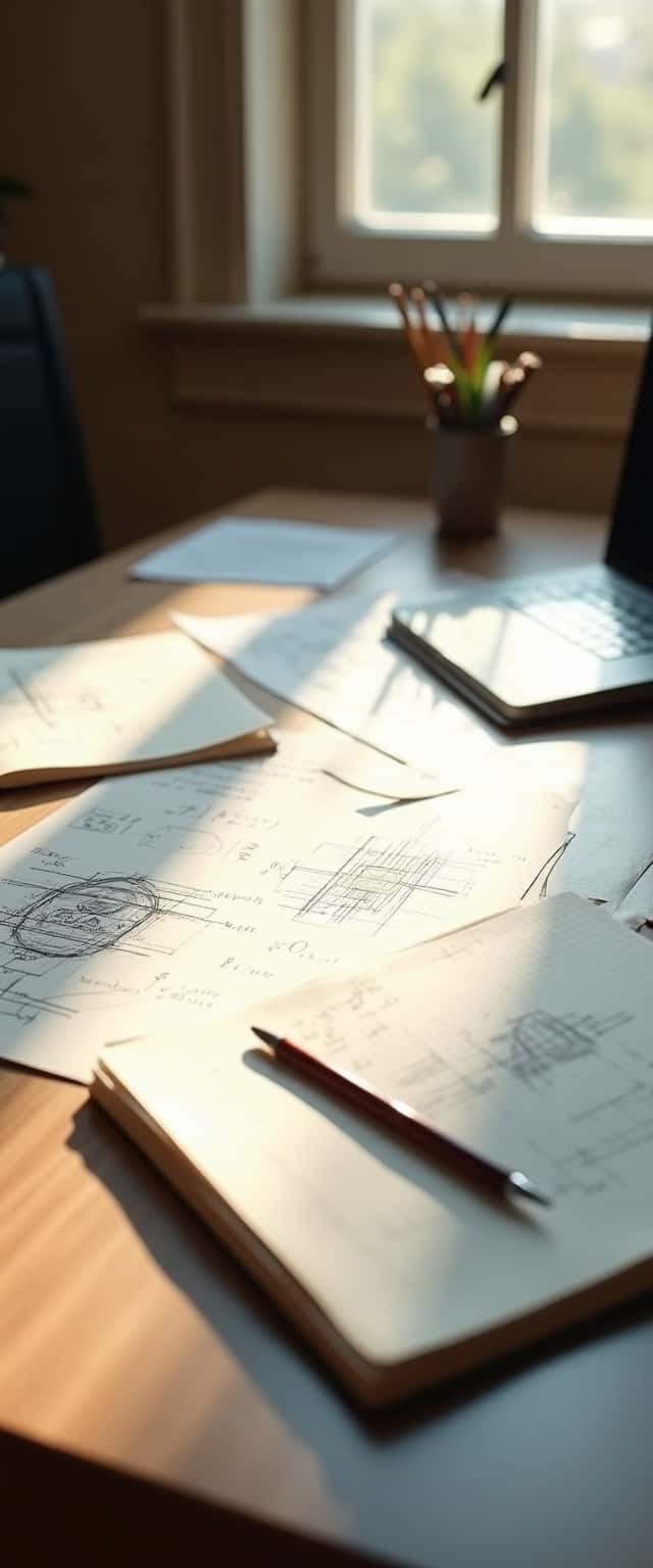 This design captures an organized workspace featuring an elegant wooden desk adorned with meticulously detailed technical sketches and equations in rich black ink. The soft sunlight filters through a nearby window, casting gentle shadows across the smooth, white surface of the desk. Papers are arranged in a semi-structured manner, showcasing both creativity and methodical planning, while writing instruments and a small plant add a touch of personality and life to the workspace. The overall ambiance conveys a sense of calm productivity, suitable for creative tasks or engineering projects.