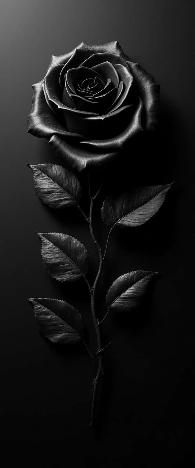 This design showcases a matte black background that serves as a dramatic canvas for a striking glossy embossed rose positioned centrally. The rose's petals curl outward in intricate detail, while the surrounding space features subtle shadows that enhance the overall depth. Delicate tendrils weave through the composition, suggesting a sense of movement and adding complexity to the layout. The monochromatic palette emphasizes luxury and sophistication, creating a captivating image with emotional resonance, ideal for various applications ranging from modern decor to fashion or branding materials.