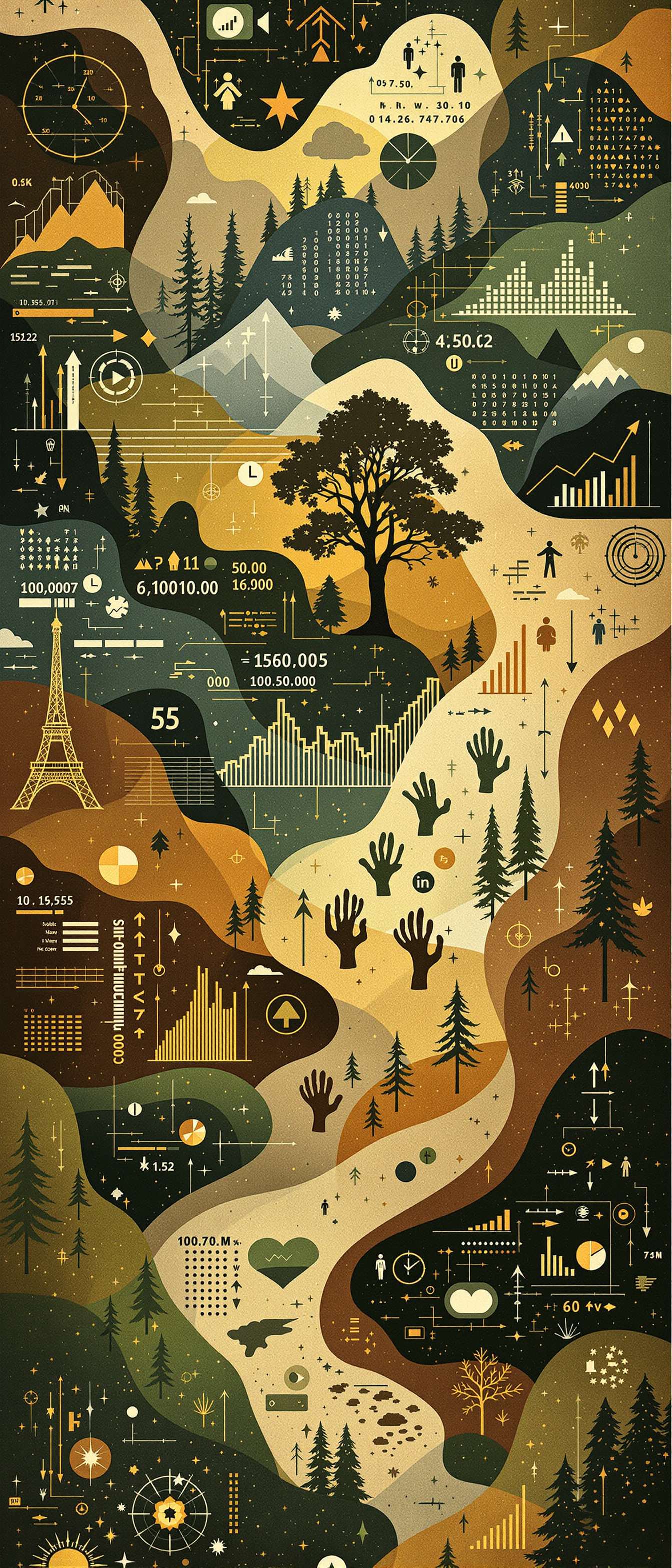 This design intricately combines elements of nature and data visualization, catering to a young entrepreneur's interests. It features stylized mountains, forests, and hunting motifs alongside graphs, charts, and coding patterns. The earthy color palette of greens, browns, and golds evokes a sense of the great outdoors while incorporating technological themes like stock symbols and binary code. The design communicates a blend of adventure and analytical thinking, ideal for a young man passionate about coding, investments, and the wilderness. Visual elements like the Eiffel Tower and health metrics suggest a global perspective and modern interests, making it a visually engaging piece for phone cases or other merchandise. Moderation note: The design features the Eiffel Tower, which is a trademarked landmark.