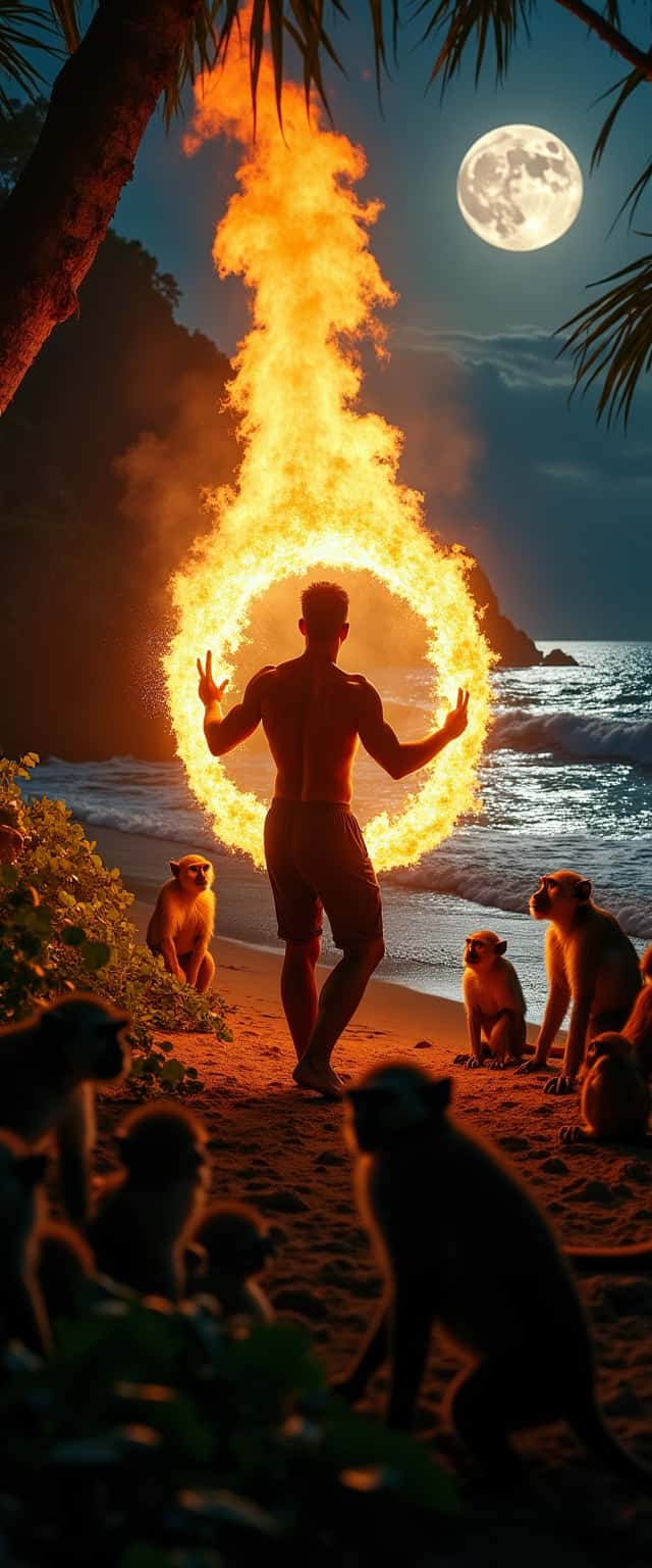 A daring 30-year-old man, radiating charisma, captivates a crowd of intrigued monkeys as he performs his fiery spectacle. The jungle’s thick foliage surrounds him, while the moonlight glimmers off the ocean waves, enhancing the thrill of the moment.