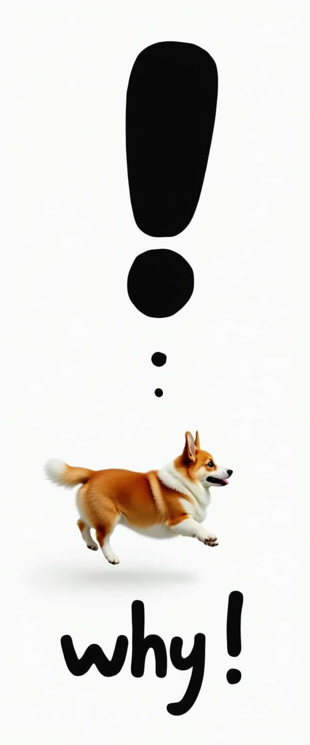 In a surreal world where gravity is defied, a fluffy corgi floats effortlessly, its golden fur fluttering like fabric in a soft breeze. Above, a colossal black exclamation point creates tension, while beneath lies a cheeky italicized 'why' sprawled boldly across a pristine white background, inviting curiosity.