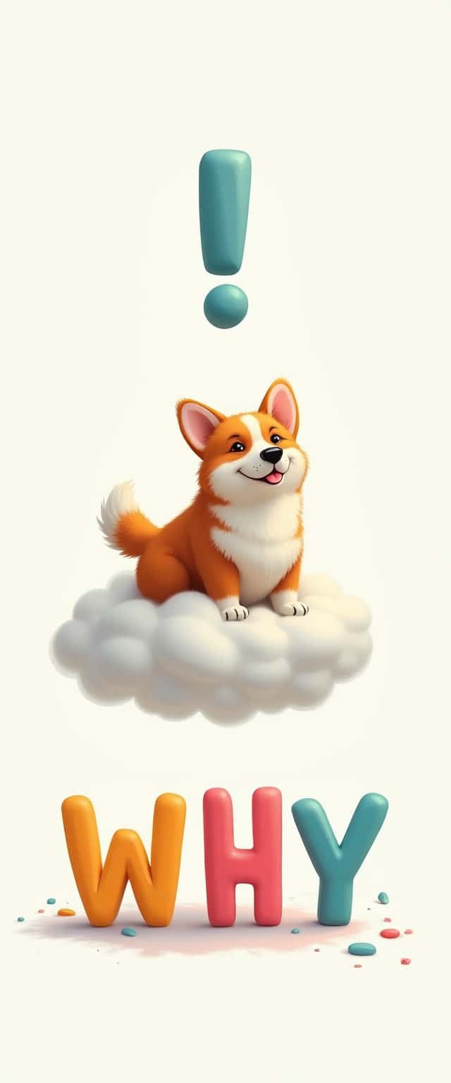 In a gravity-defying realm, a fluffy corgi floats peacefully amid puffy clouds. An oversized, shadowy exclamation point hovers above, while below, vibrant letters spell out 'why' in playful italics, splashed across the soft white backdrop.