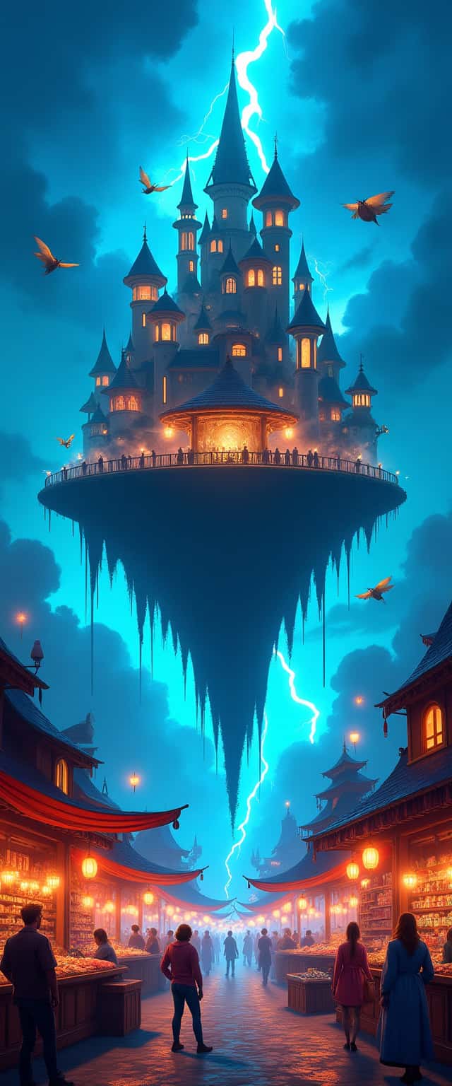 This design showcases a fantastical floating island marketplace, suspended in a striking cerulean sky. The foreground features vibrant market stalls, each adorned with colorful awnings and illuminated by warm lanterns. Vendors offer an array of whimsical goods, including bottled lightning and color-shifting paints, while intricate sky bridges connect the stalls, enhancing the sense of elevation and magic. Above, a grand castle rests on the floating island, with its turrets and spires reaching into the sky, where bolts of lightning dance amongst fluffy clouds. The presence of whimsical creatures fluttering in the scene adds a playful element, capturing an enchanting, otherworldly atmosphere.