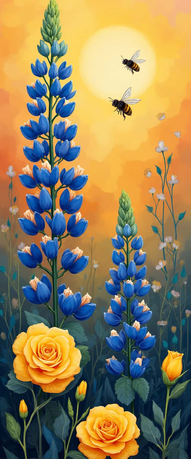 This design features an enchanting arrangement of bluebonnet lupines and vibrant yellow roses, set against a serene sunset backdrop. The warm hues of orange and yellow blend harmoniously, creating an inviting atmosphere. Playful geometric patterns intersperse with detailed floral elements, while two cute bumblebees flit about, infusing the composition with life and whimsy. The overall aesthetic is cheerful and attractive, perfect for making a statement with its vibrant colors and lively imagery.