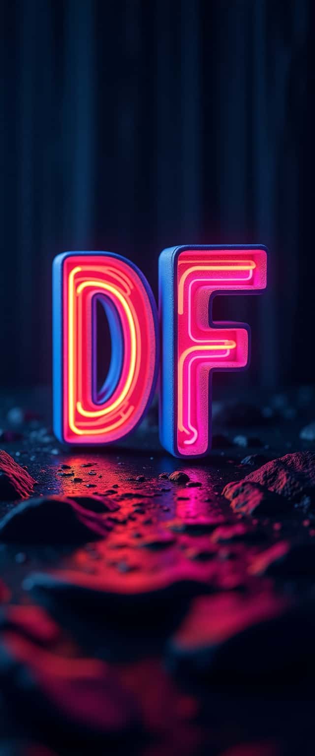 This 3D design features the letters 'DF' in vibrant neon hues, vividly standing out against a textured black background. The bold typography is enhanced by a parallax effect, creating a sense of depth and movement as if the letters are floating. The dynamic lighting accentuates the intricate curves of the lettering, casting reflections on the surface below, which is adorned with subtle rocky textures. The contrasting elements of bright neon colors against a dark backdrop enhance the futuristic aesthetic, making this design ideal for tech-related themes or modern branding.